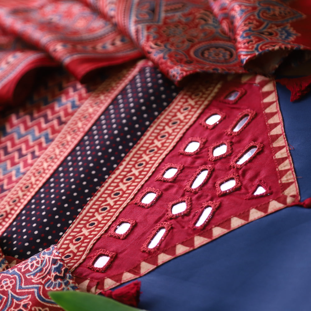 Raavi Denim Blue and Red Mashru Patch with Mirror in Glazed Cotton Suit Set
