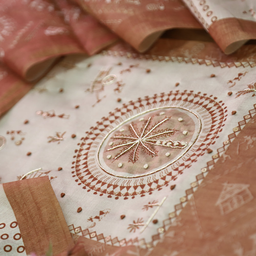 Raavi Peanut Brown Spiral with French Knot Work in Verli Printed Art Silk Chanderi Set