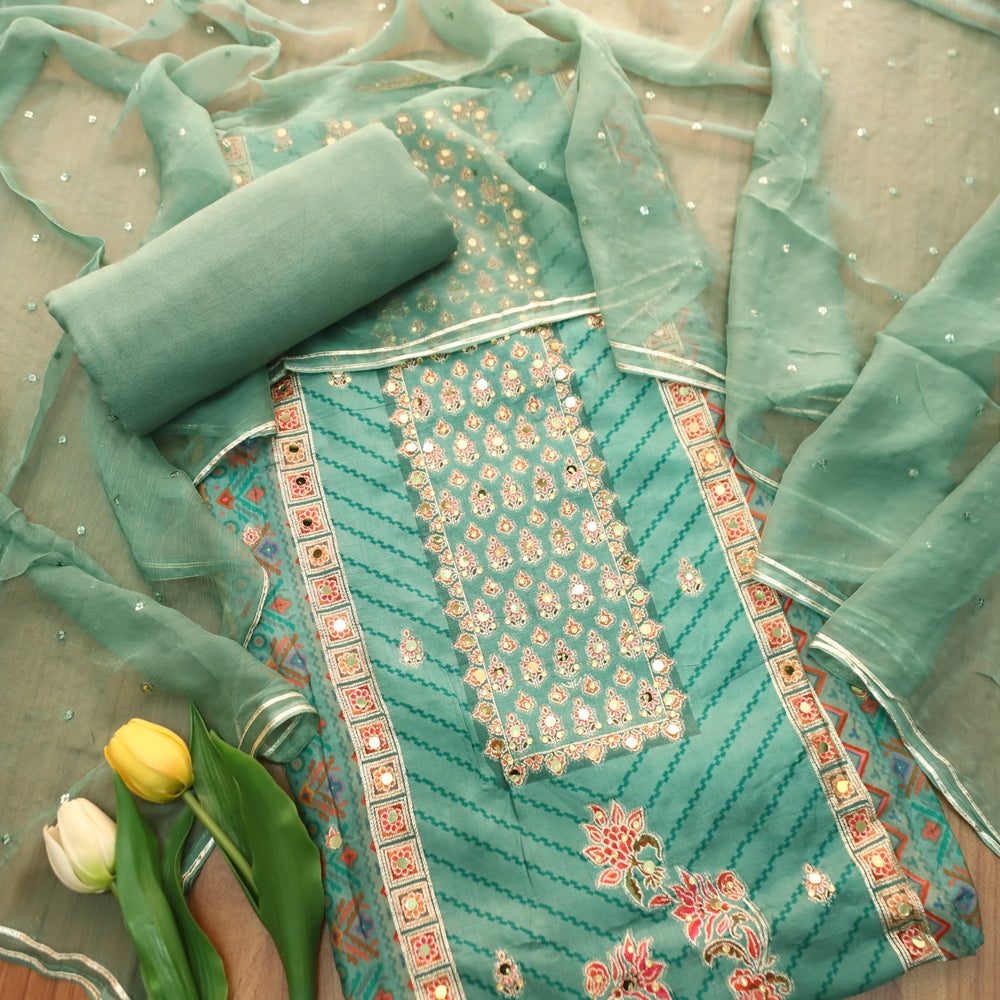 Rahi Aqua Teal Zari and Thread Weaved with Mirror Work Art Silk Suit Set