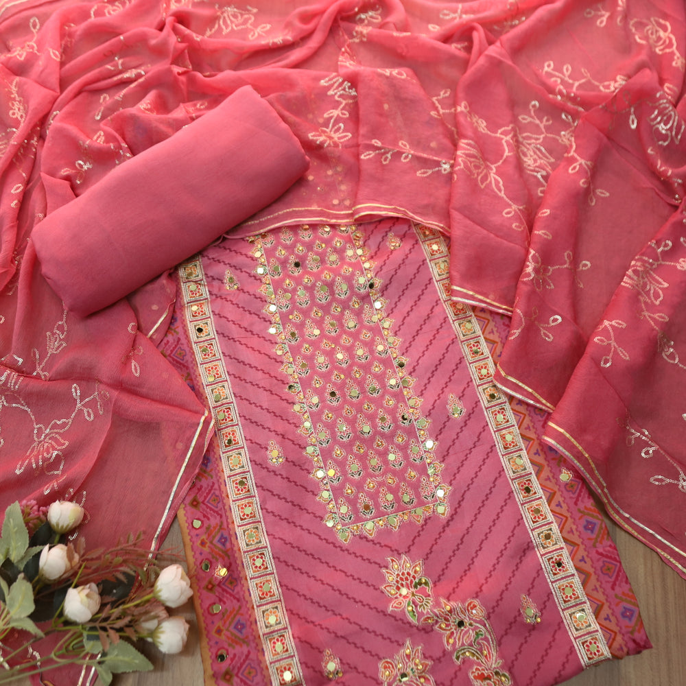 Description- Graceful Art Silk Suit with Mirror & Zari Work This exquisite suit set is crafted in luxurious art silk, featuring delicate zari and thread embroidery enhanced with mirror work, adding a touch of sparkle and elegance. The outfit is further complemented by a soft chiffon dupatta adorned with subtle embroidery, making it perfect for festive occasions, parties, and celebrations.