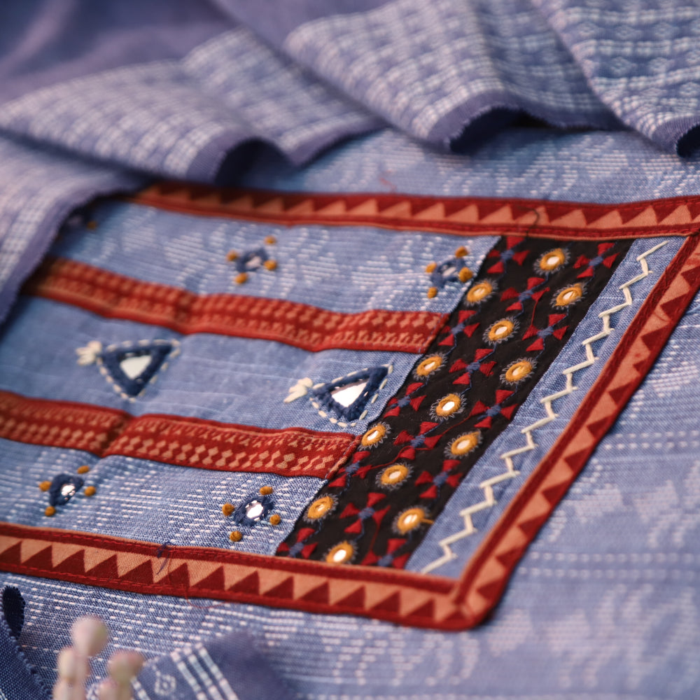 Reshmi Faded Blue Kutch Mirror Work in All Over Weaved Handloom Cotton Set D1