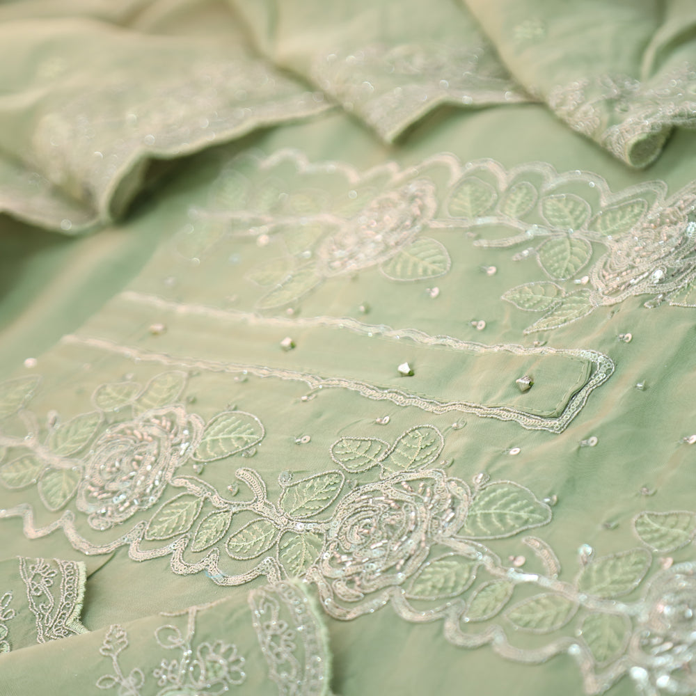 Rooh Sage Green Embellished Neckline with Thread Work Organza Suit Set