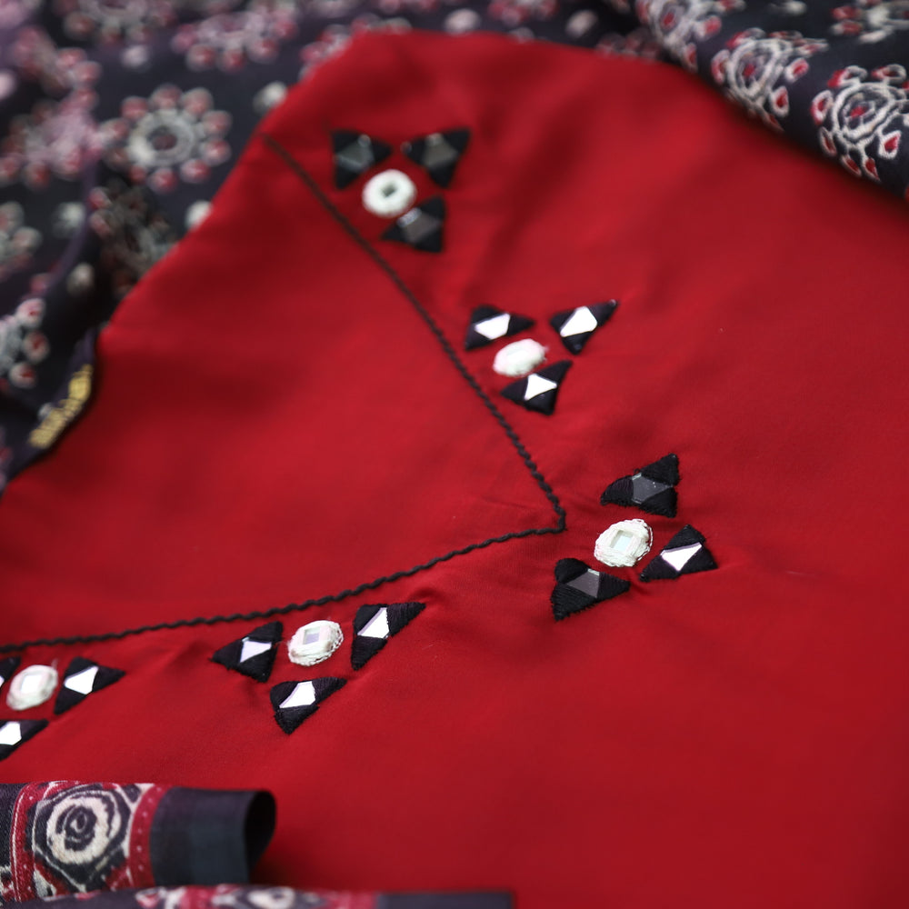 Description- This charming ensemble includes a pretty Roman Silk top adorned with mirror work detailing neckline, adding a subtle sparkle. It's perfectly complemented a printed Art Silk dupatta, creating a harmonious blend of traditional patterns and contemporary style.
