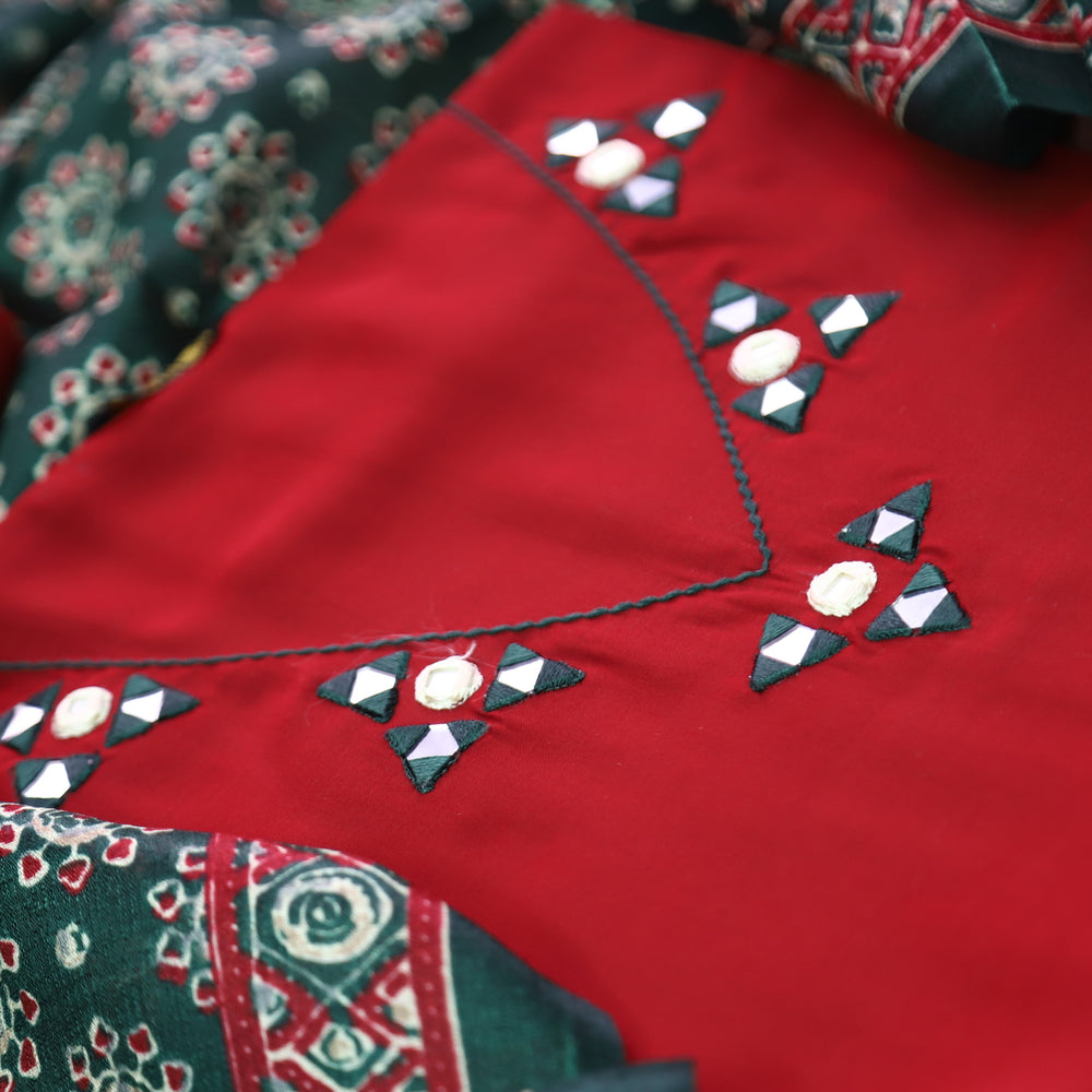 Description- This charming ensemble includes a pretty Roman Silk top adorned with mirror work detailing neckline, adding a subtle sparkle. It's perfectly complemented a printed Art Silk dupatta, creating a harmonious blend of traditional patterns and contemporary style.