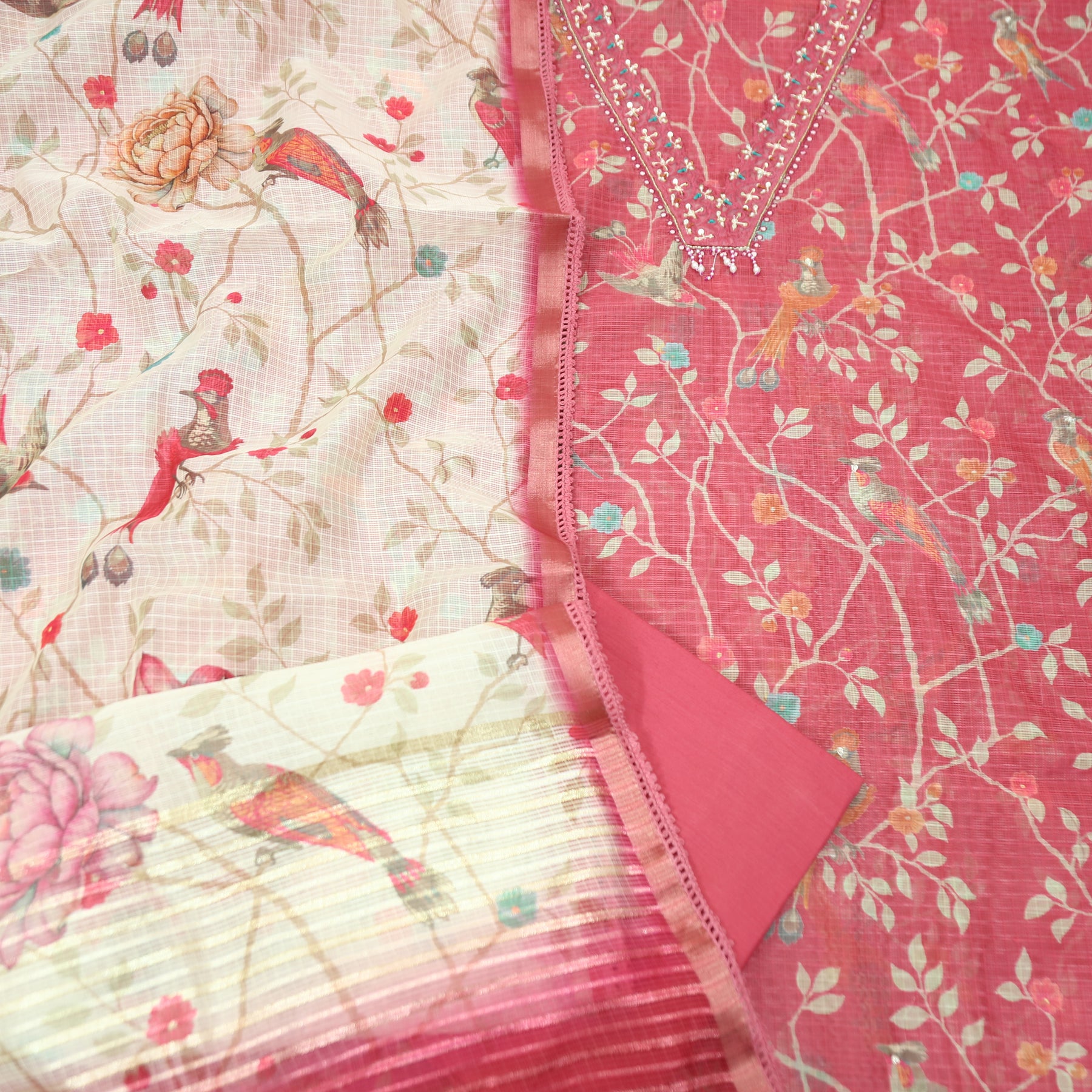 Sahiba Barn Blush V Neck with Moti and Kardana Work Floral Print Kota Doriya Set