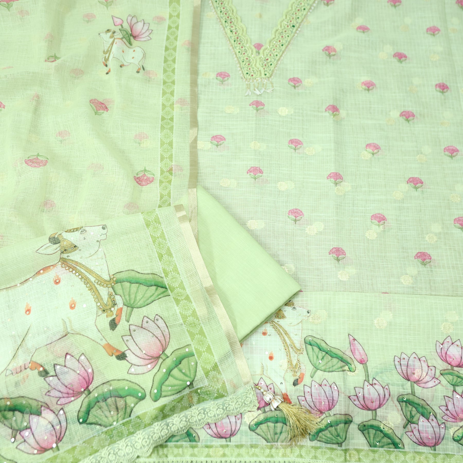 Sahiba Mint Green V Neck with Moti and Kardana Work Pichwai Print Kota Doriya Set