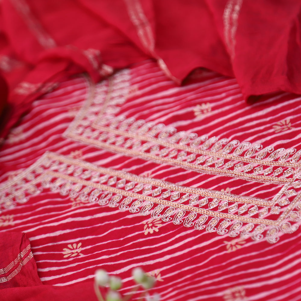Description-Make a graceful statement in this pretty leheriya-printed top, adorned with elegant zari embellishments that add a touch of shimmer. Paired with a soft cotton silk dupatta, this ensemble beautifully blends intricate detailing with luxurious fabrics—perfect for festive occasions or elegant daywear.