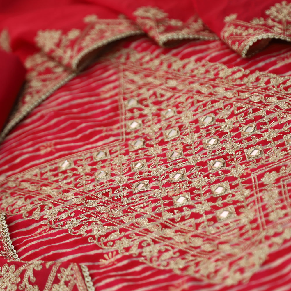 Description-Make a graceful statement in this pretty leheriya-printed top, adorned with elegant zari embellishments that add a touch of shimmer. Paired with a soft cotton silk dupatta, this ensemble beautifully blends intricate detailing with luxurious fabrics—perfect for festive occasions or elegant daywear.