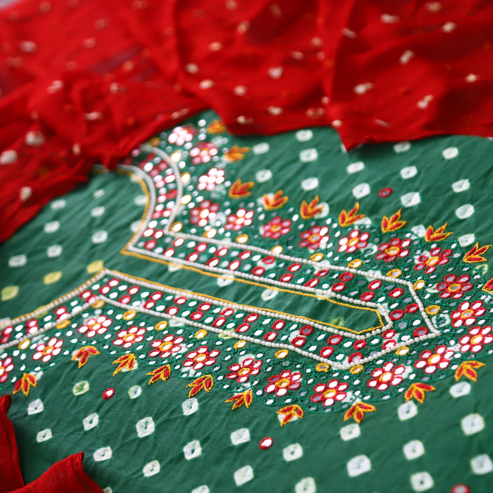 Jhanvi Sac. Green Embellish Neckline in All Over Authentic Bandhej Work Cotton Set