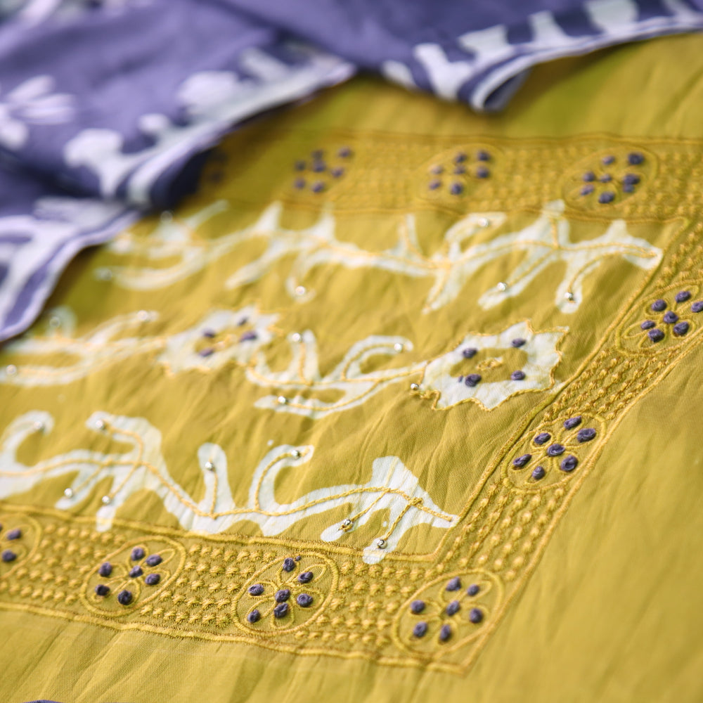 Sulari Dijon Yellow with French Knot Work in Batik Print Neck Chanderi Suit Set