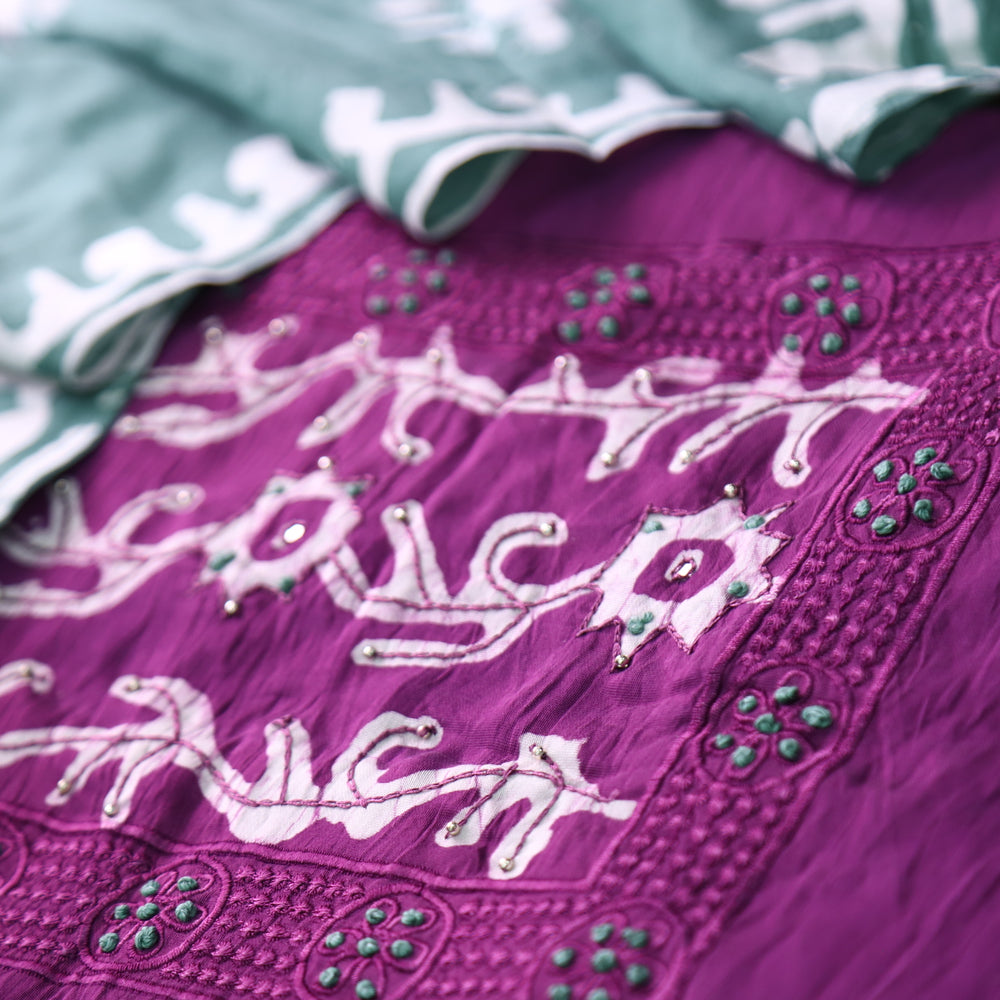 Sulari Vibrant Purple with French Knot Work in Batik Print Neck Chanderi Suit Set