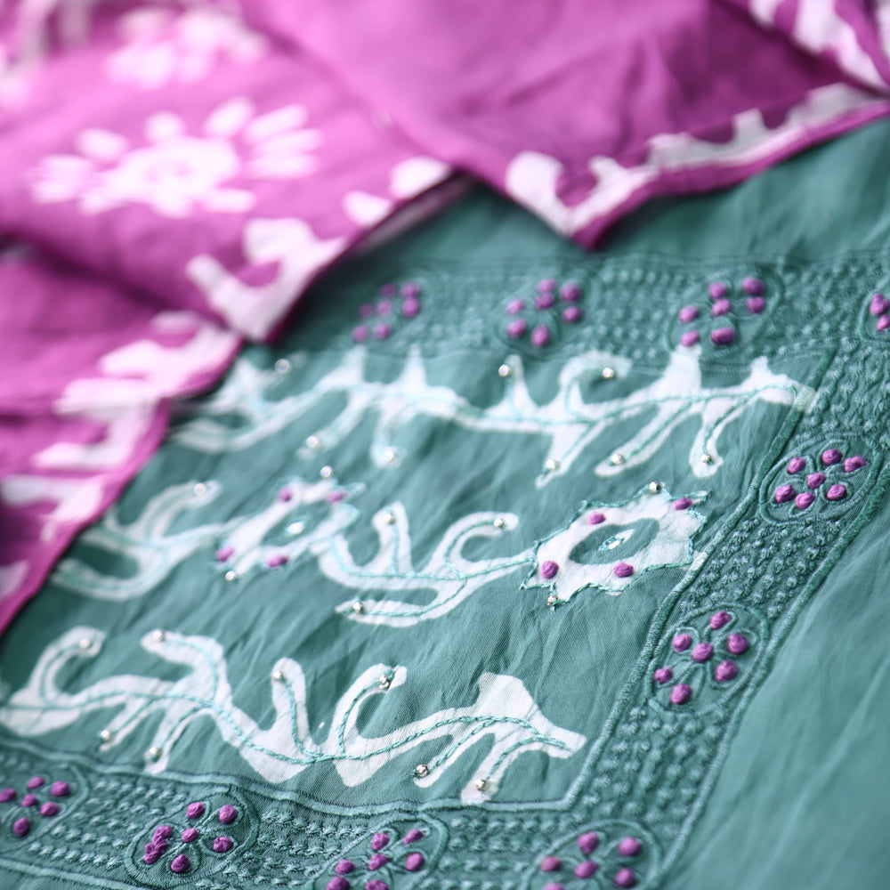 Sulari Dark Sage with French Knot Work in Batik Print Neck Chanderi Suit Set
