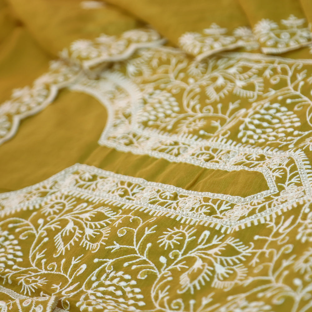 Sundra Mustard Yellow All Over Thread Embroidered Work with Moti Chanderi Suit Set