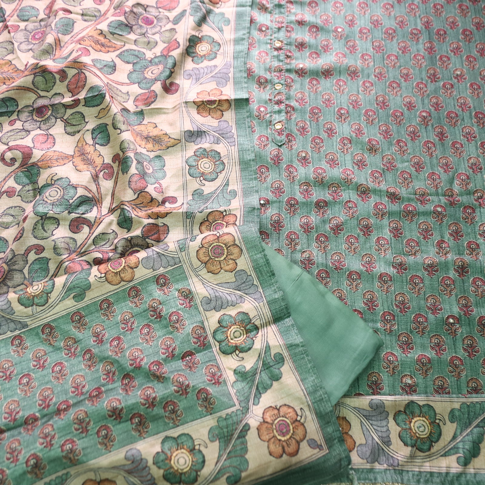 Vrinda Fern Green Kalamkari Digital Printed with Patra Work Tussar Silk Chanderi Set
