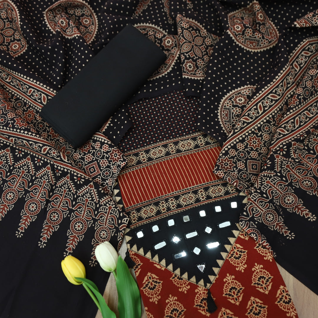 Roshni Cherry Red Thread Embroidered Yoke on Ajrak Printed Cotton Suit Set