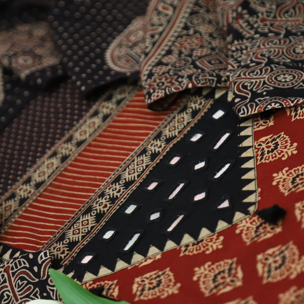 Sundri Berry Red Kutch Patch with Mirror in Embroidered Yoke Printed Cotton Set