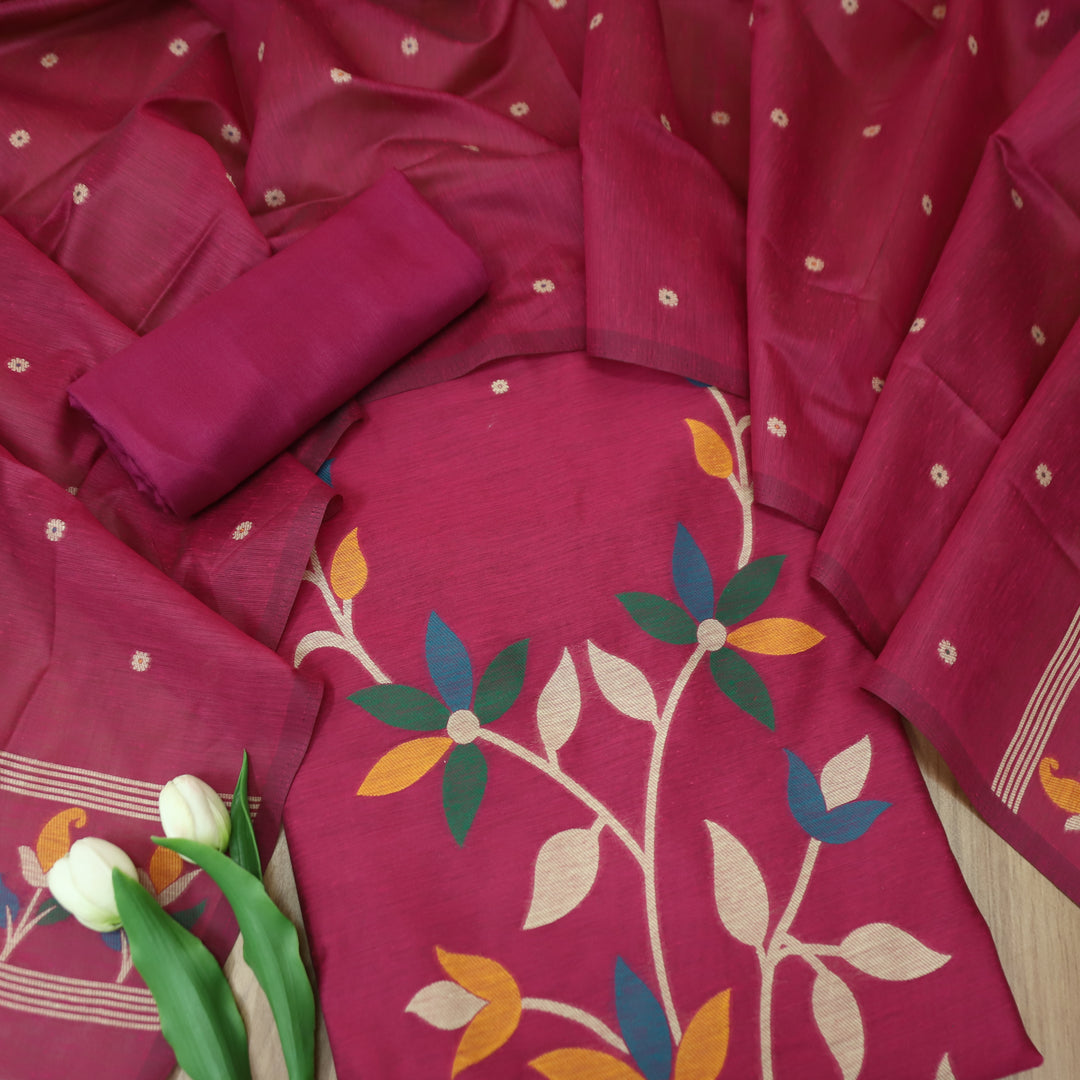 Vishakha Magenta Pink All Over Authentic Jamdani Weaved Hem Chanderi Suit Set