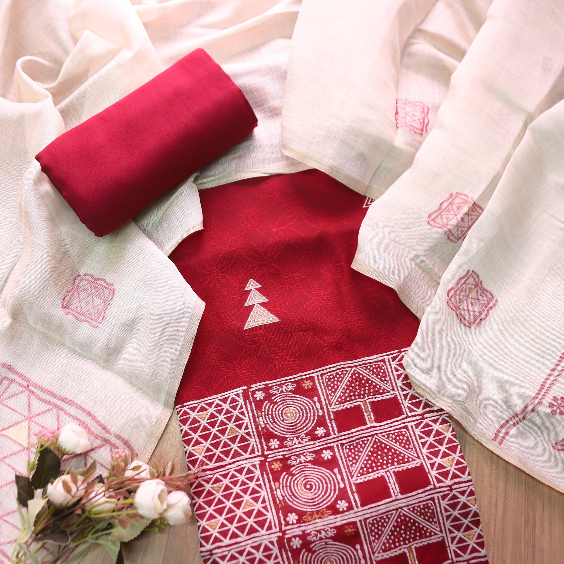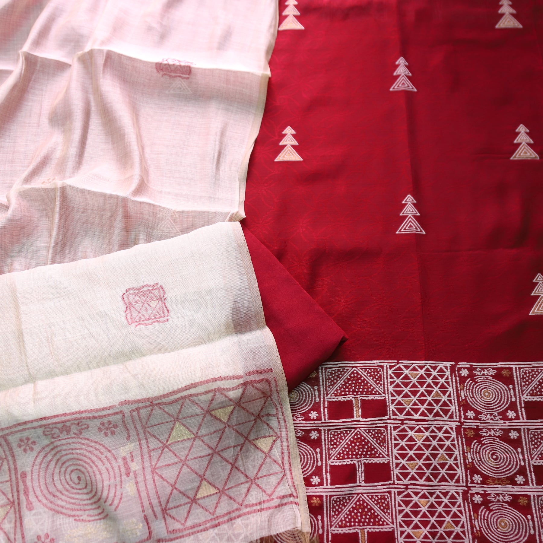 Jannat Maroon Red All Over Self Weaved Work in Authentic Jamdani Chanderi Set