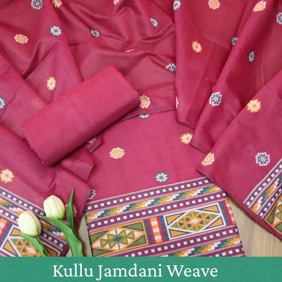 Description- This elegant Chanderi suit set is inspired by traditional Jamdani and Kullu weaving. Featuring subtle woven motifs and a beautifully detailed border, it offers a graceful blend of heritage craftsmanship and timeless comfort, perfect for festive and ethnic wear.