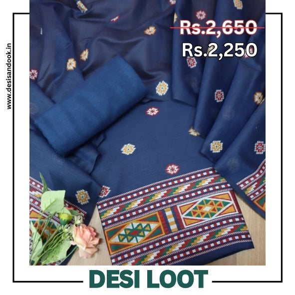 Description- This elegant Chanderi suit set is inspired by traditional Jamdani and Kullu weaving. Featuring subtle woven motifs and a beautifully detailed border, it offers a graceful blend of heritage craftsmanship and timeless comfort, perfect for festive and ethnic wear.