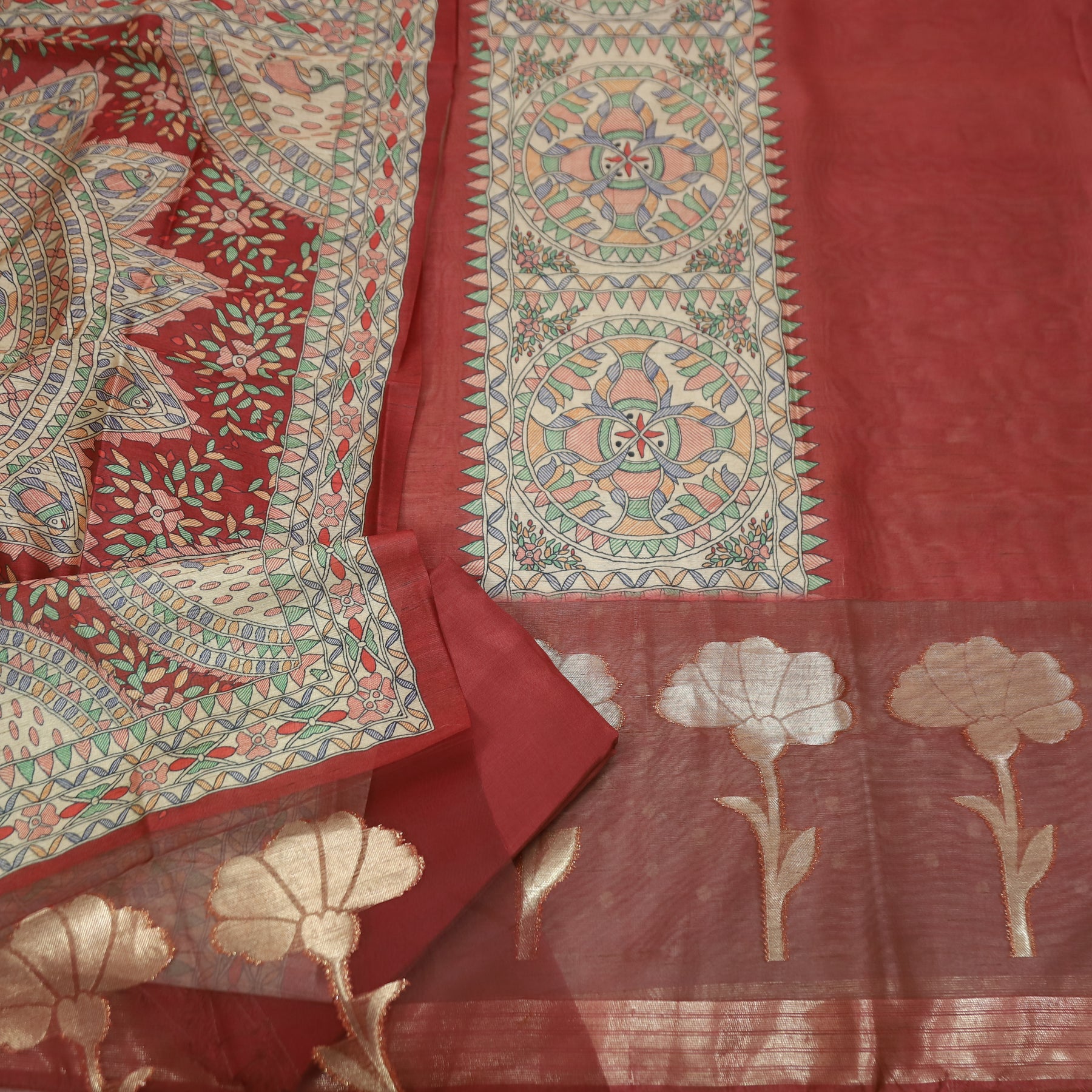 Saheli Bride Red Madhubani Print with Zari Detailing Korean Tussar Chanderi Set