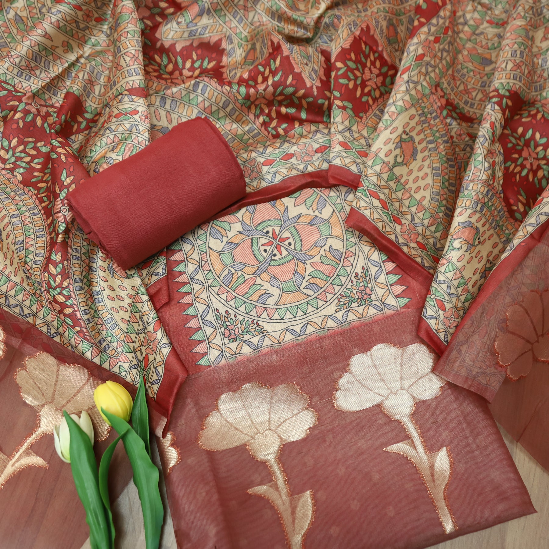 Description- A premium Korean Tussar Chanderi suit set beautifully adorned with intricate Madhubani block print in rich, earthy tones. The top features detailed square Madhubani motifs, paired with a soft plain bottom and a sheer Chanderi dupatta finished with subtle zari motifs. A perfect blend of tradition, texture, and timeless elegance.