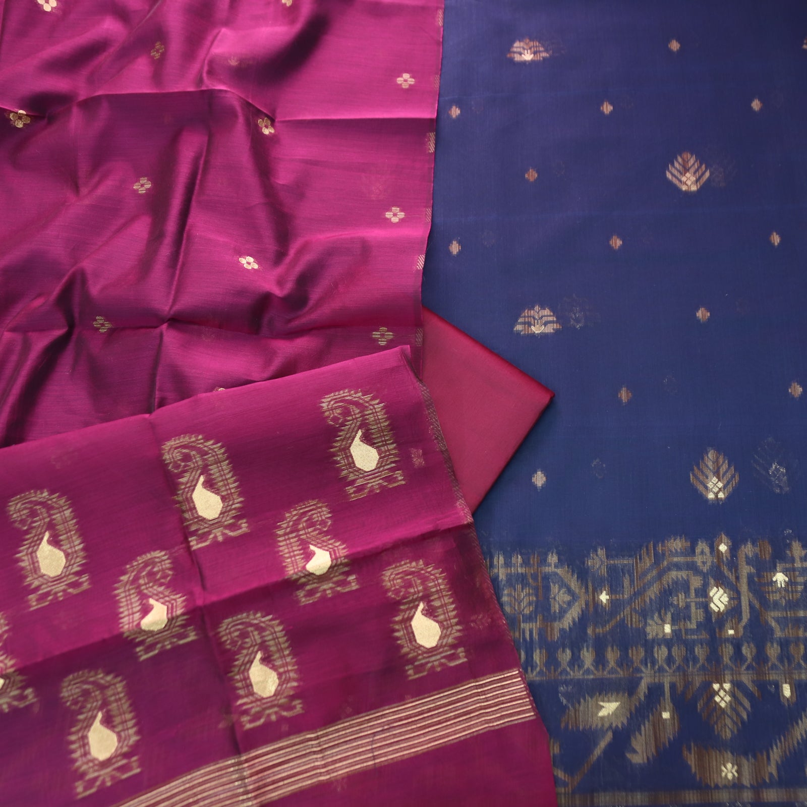 Description- Elevate your ethnic wardrobe with this authentic Chanderi suit set, featuring a vibrant royal blue top adorned with traditional Jamdani weaving motifs along the body and border. The set is complemented with a contrasting bright bottom and a Chanderi dupatta intricately woven in authentic Jamdani designs, exuding timeless artistry and cultural elegance. Perfect for festive occasions and traditional gatherings