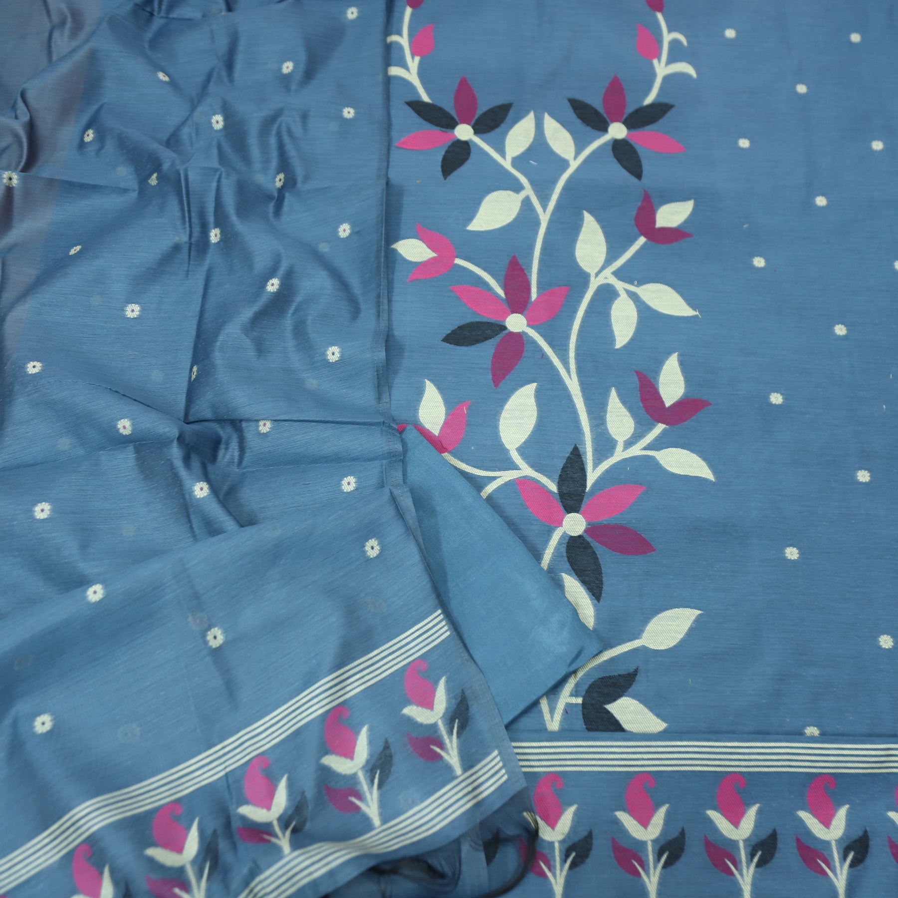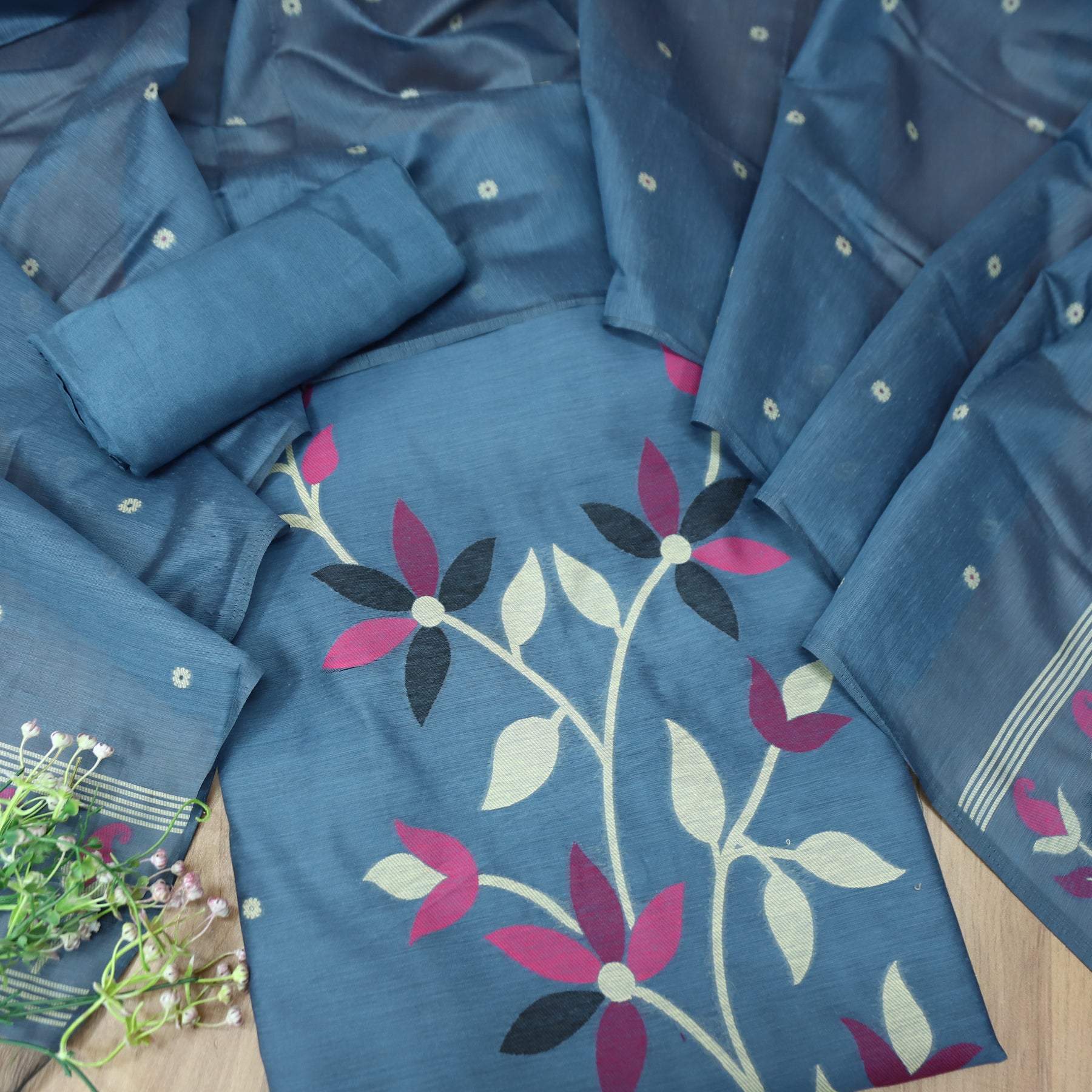 Vishakha Powder Grey All Over Authentic Jamdani Weaved Hem Chanderi Suit Set