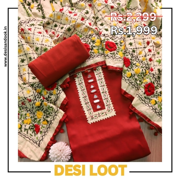 Phoolkumari Bride Red Mirror In Front with Patch Glazed Cotton Suit Set