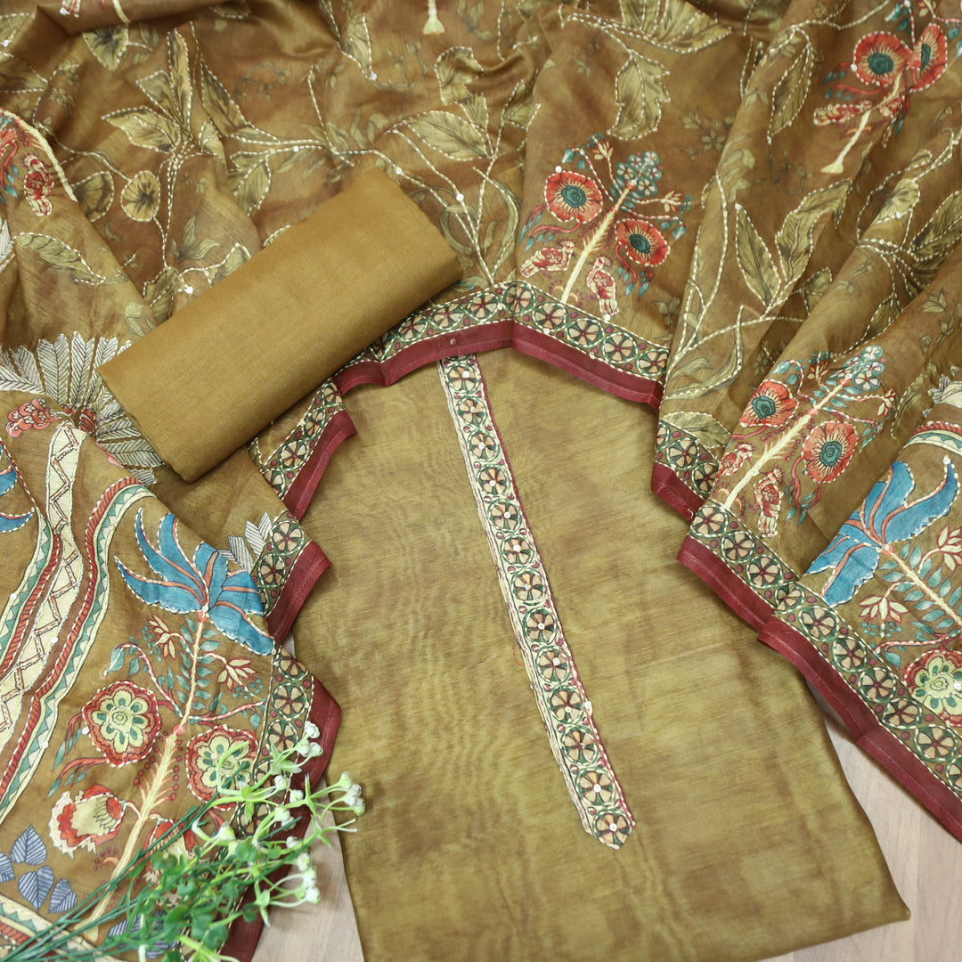 Sajna Olive Green All Over Kantha Embroidery Neck and Hem Work Chanderi Set