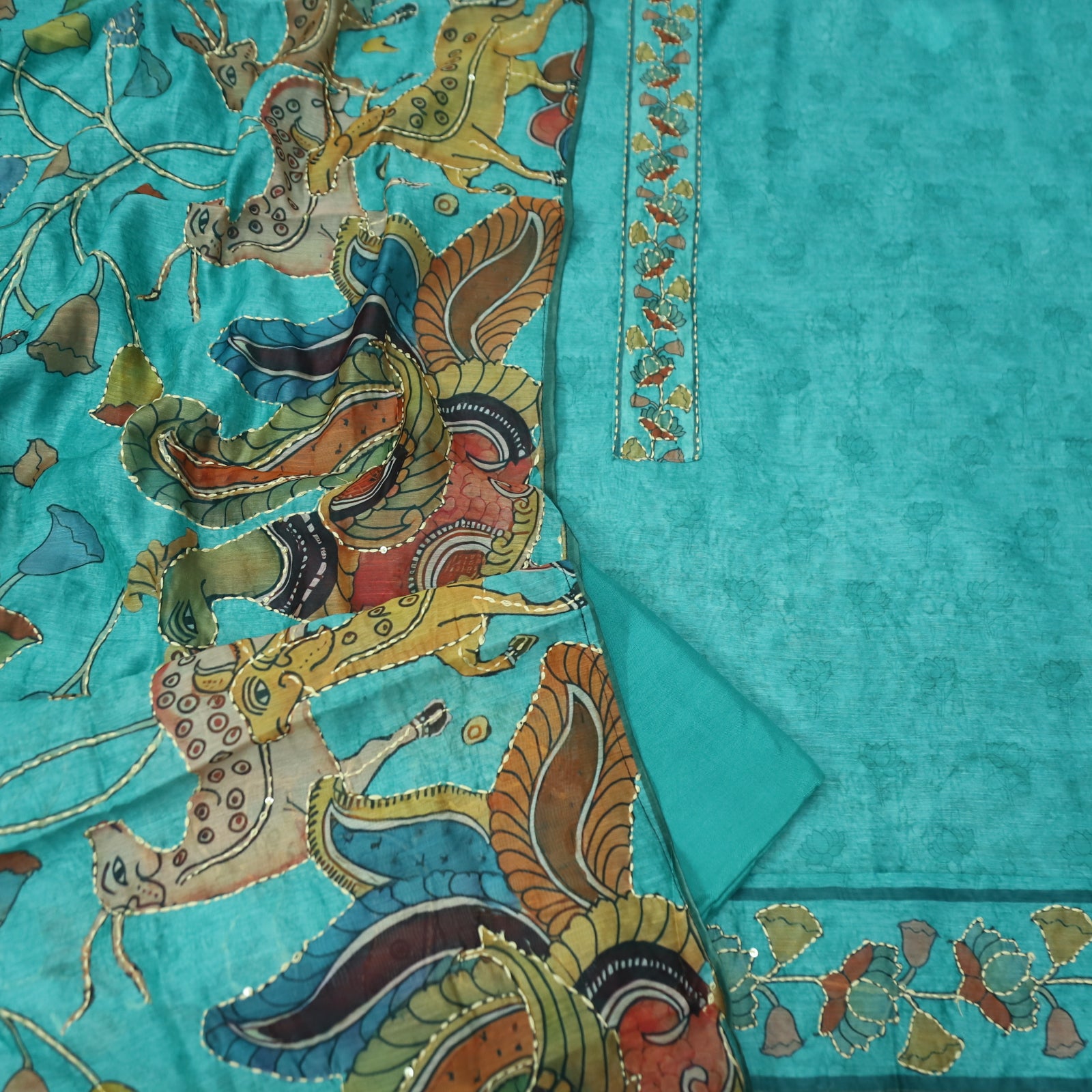 Shobha Aqua Blue with Kantha Embroidery Neck Work Chanderi Suit Set
