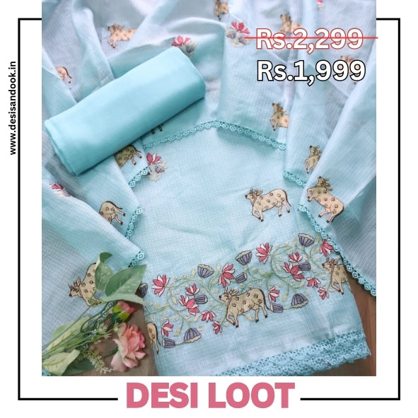 Khayal Powder Blue Pichwai Thread Embroidery Hem Work Kota Doriya Suit Set