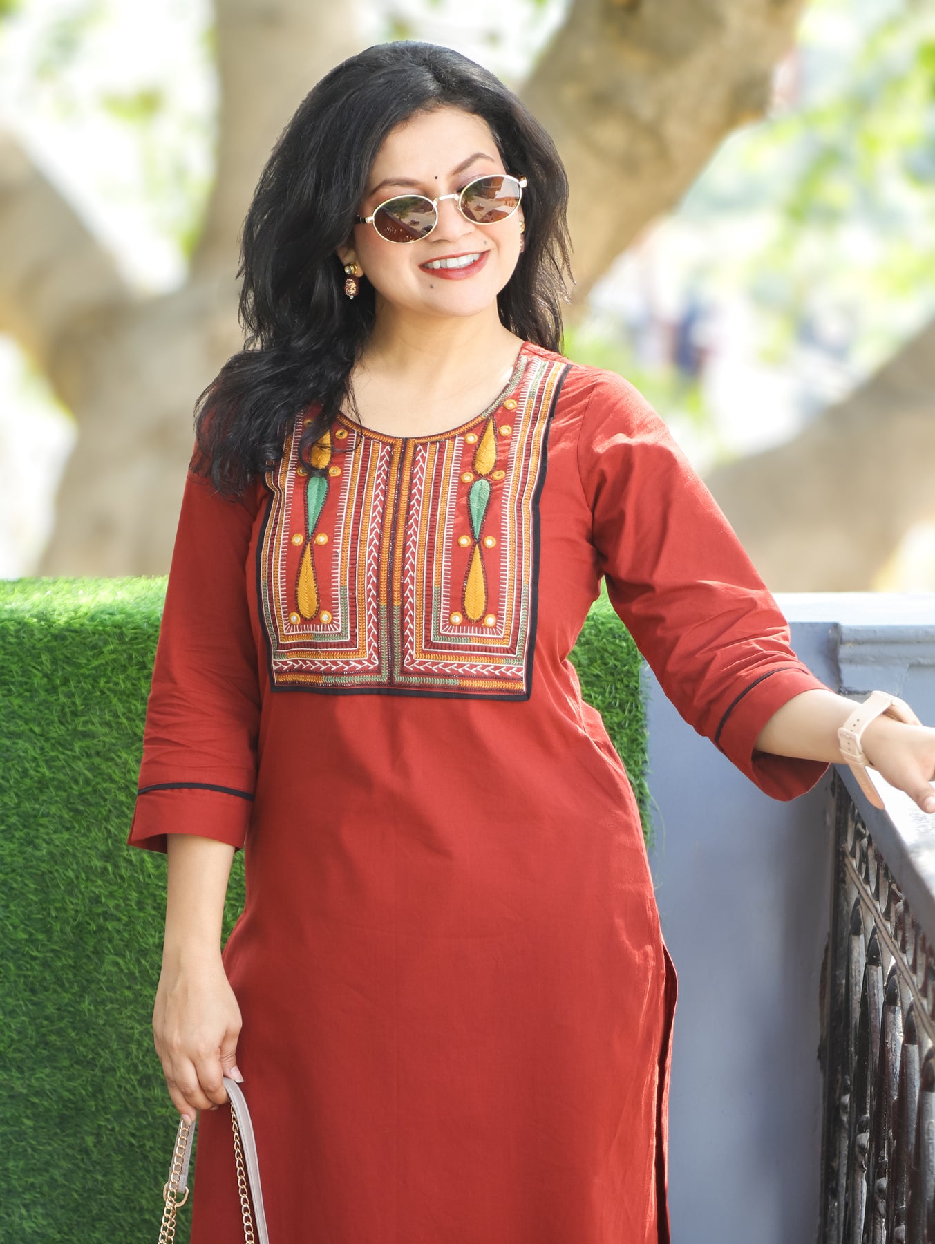 Chanda Velvety Maroon Thread Embroidered Neck Yoke Work Cotton Kurti