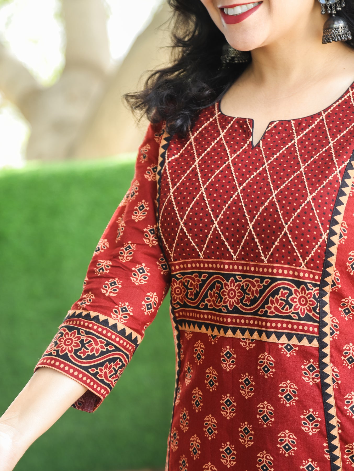 Mehram Maroon Red Running Thread Yoke in Panel Style Ajrak Printed Cotton Kurti