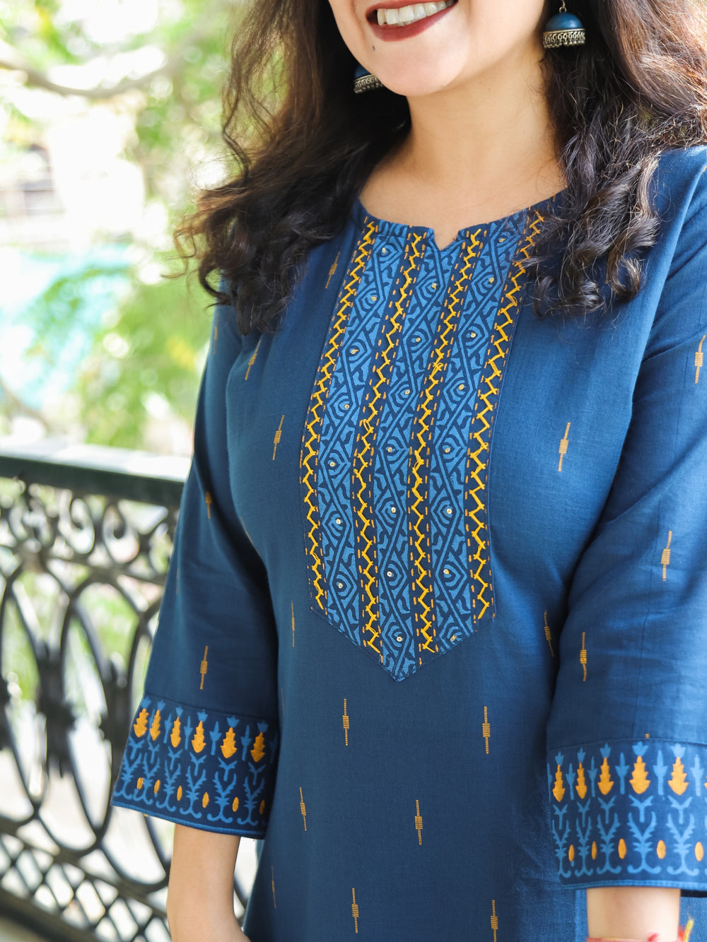 Saloni Denim Blue Thread with Sequine Work in Pigment Printed Cotton Kurti