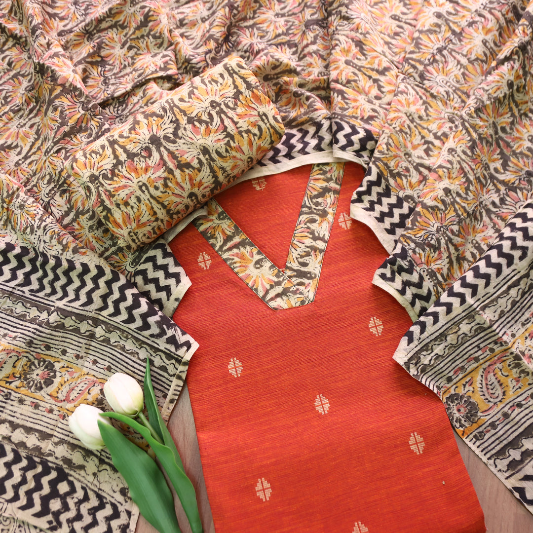 Pranda Orange Jamdani Jacquard Weaved Paithani Inspired Tussar Silk 3 Piece Set