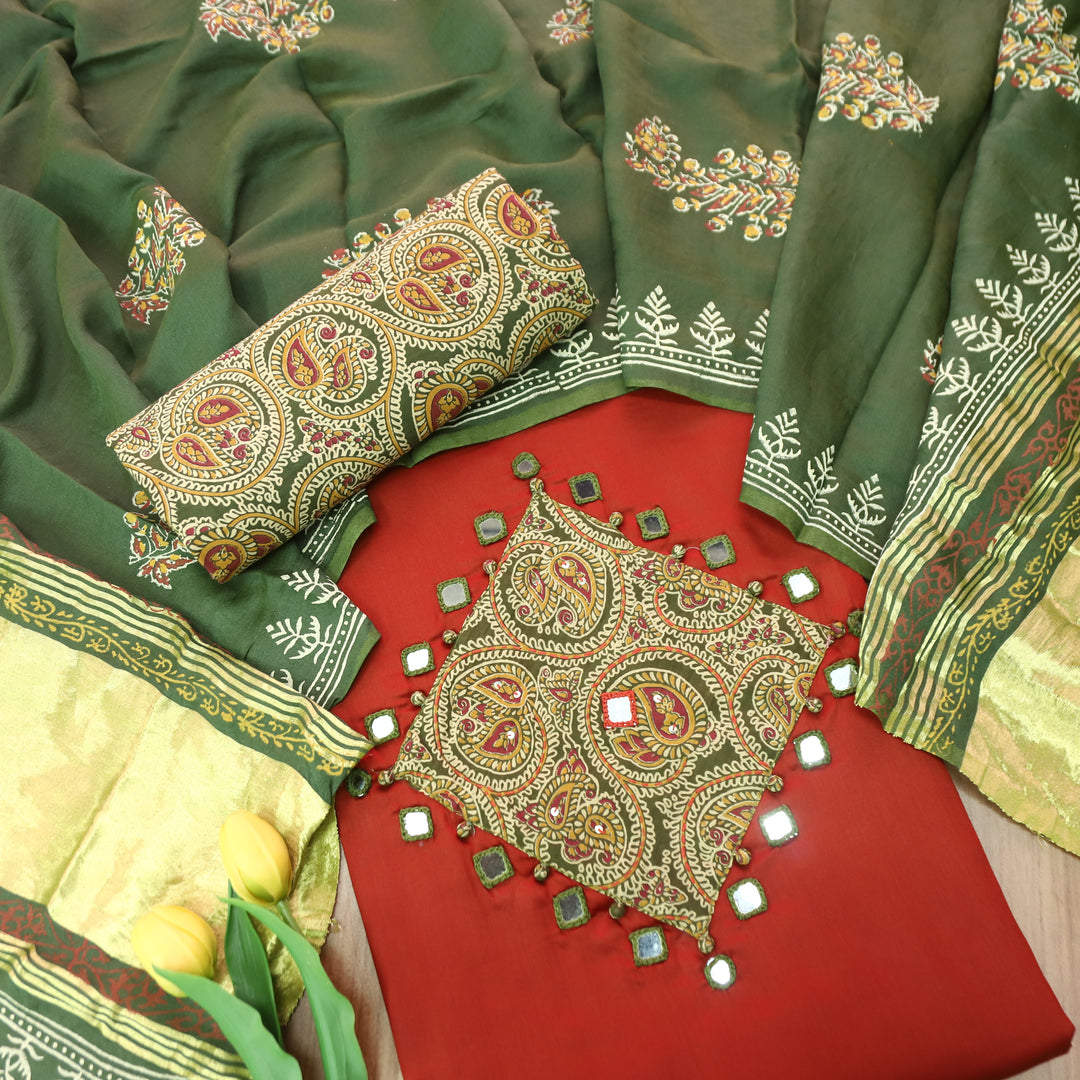 Nigahein Bride Red Mirror Work Applique Kalamkari Print Patch Jam Cotton Set