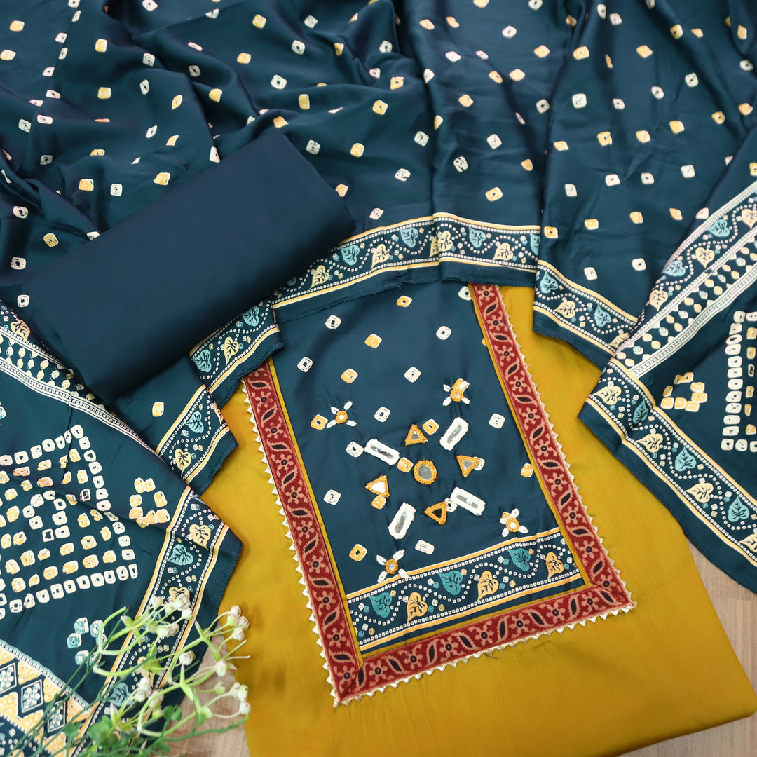 Rangroop Green with Orange Thread with Mirror Yoke Ikkat Print Cotton Suit Set