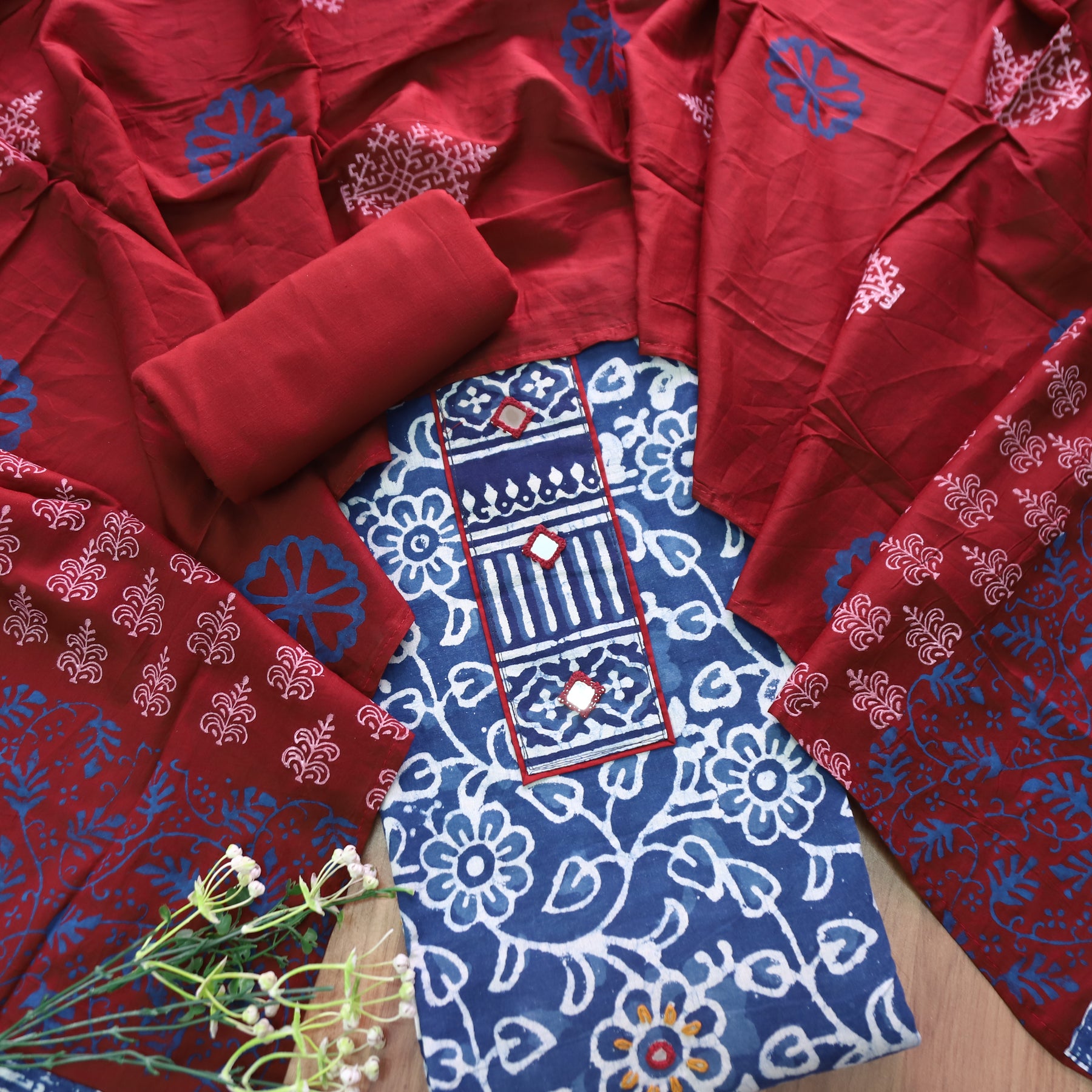 Description- A stunning ensemble featuring a dabu indigo printed cotton top with mirror Kutch work on the top, paired with a cotton bottom adorned with a patch on the hem. The look is completed with a block print dupatta creating a harmonious blend of traditional techniques and contemporary style.
