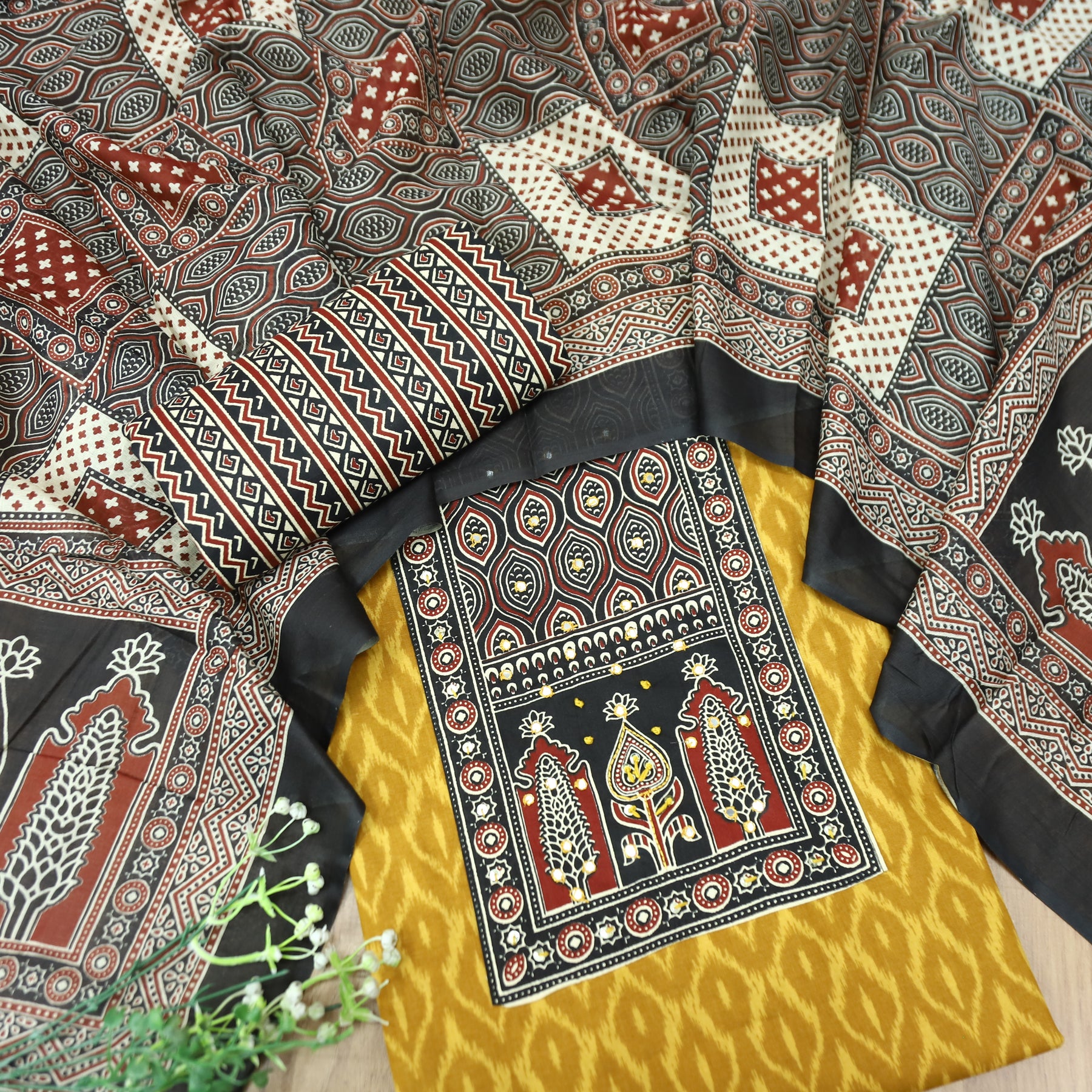 Description- Elevate your ethnic wardrobe with this stunning traditional ikkat print suit set in rich tones. The cotton top features intricate ikkat print and mirror work yoke detailing , It comes with a beautifully matched cotton bottom and a classic bloack print cotton dupatta, adorned with elaborate geometric and ikkat patterns. Perfect for festive occasions and cultural celebrations!