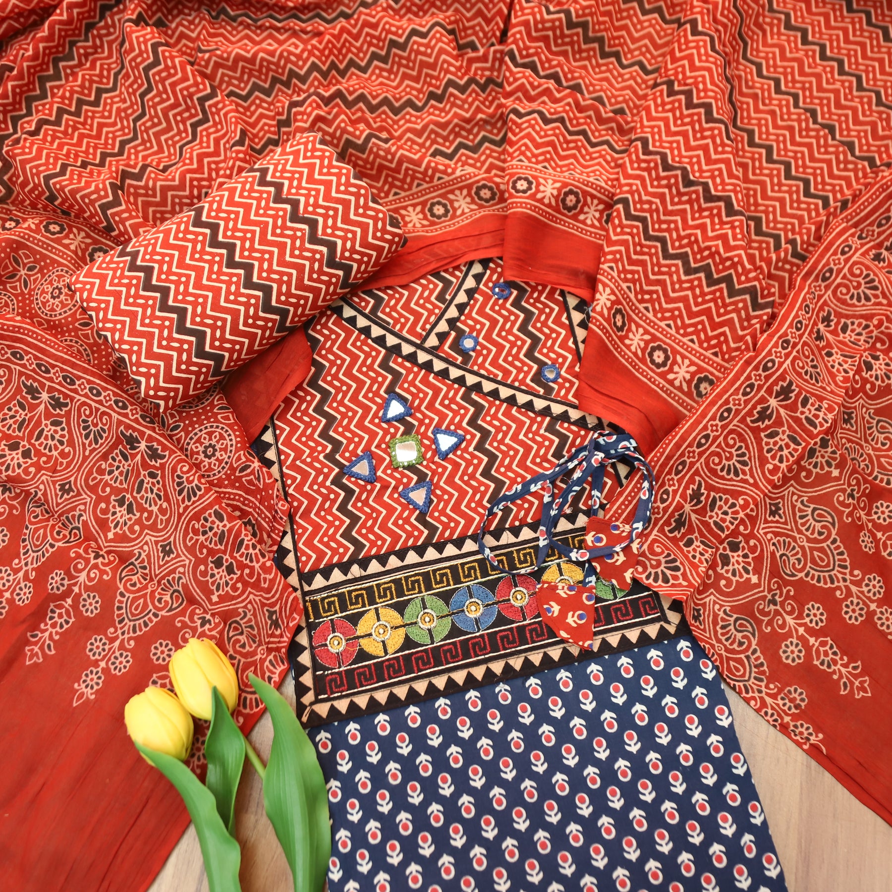 Description- Introducing our Kutch Work Printed Cotton Top, showcasing intricate Embroidered Yoke work along the neckline. Paired flawlessly with a thread work Cotton Dupatta, this ensemble seamlessly blends traditional artistry with modern design. The top's vibrant Kutch work and thread embellishments harmonise with the dupatta's prints, creating a captivating look that embodies cultural heritage.