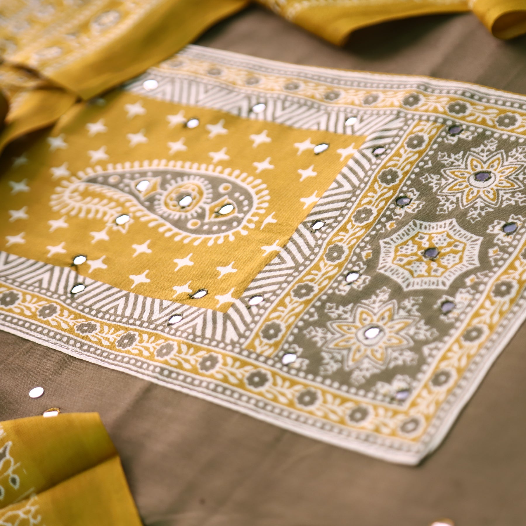 Description- This elegant glazed cotton suit set features a beautifully detailed digital printed yoke highlighted with delicate patra work. Paired with a matching printed cotton dupatta, it offers a perfect blend of comfort and traditional charm, ideal for everyday elegance or festive wear.