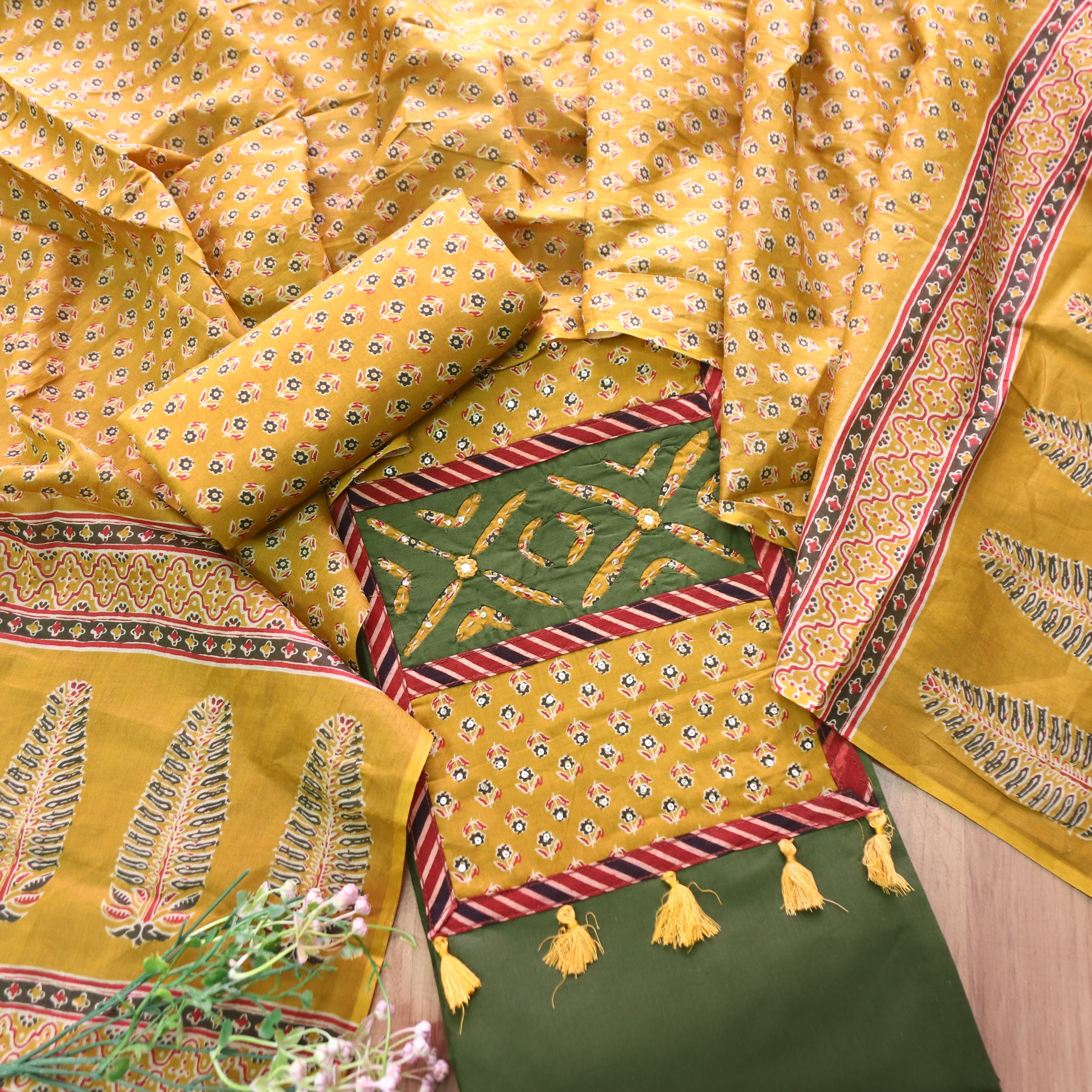 Raashi Pine Green Applique Patch Yoke Cotton Suit Set