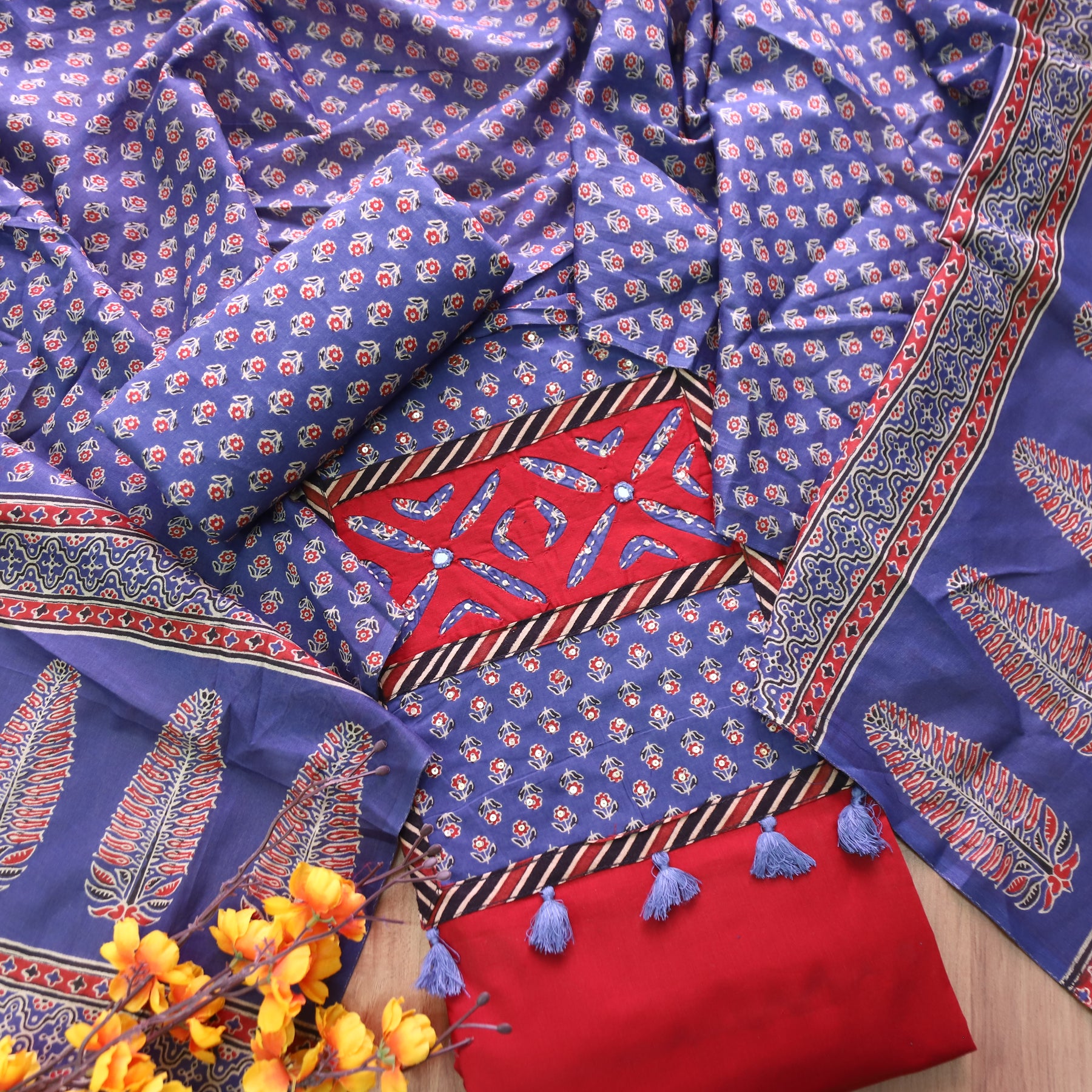 Description: A delightful ensemble featuring a cotton top adorned with ajrak print patches on the neck, paired elegantly with a matching ajrak block-printed cotton dupatta. This combination offers a fresh and stylish look with a blend of floral elegance and subtle embellishments on the soft texture of cotton."