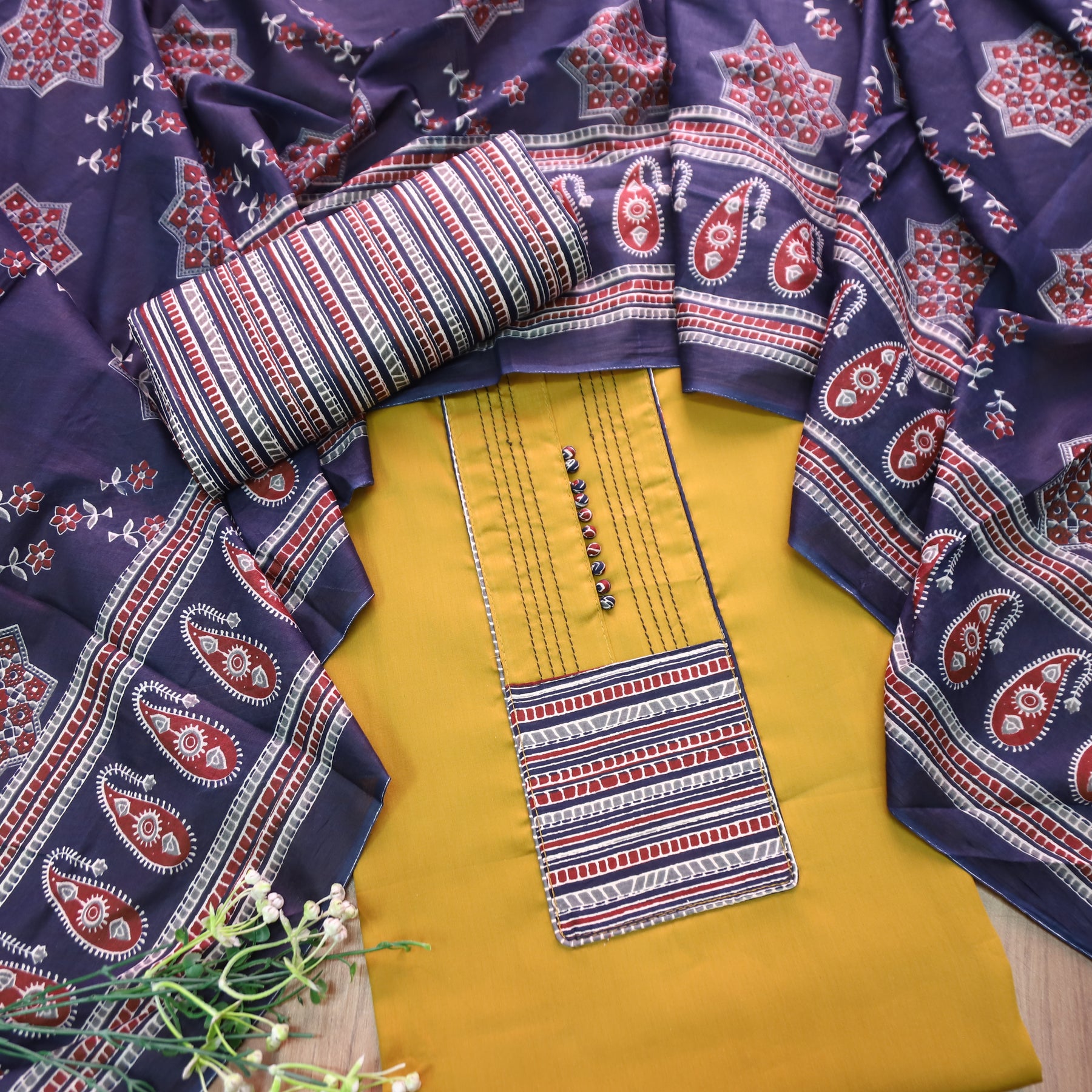 Description- This cotton suit set features a clean, solid-toned top accented with elegant potli buttons on the neckline and a beautifully placed Ajrak print patch for a handcrafted touch. It is paired with a coordinated printed cotton bottom and a matching printed dupatta, creating a perfect balance of simplicity and traditional charm..