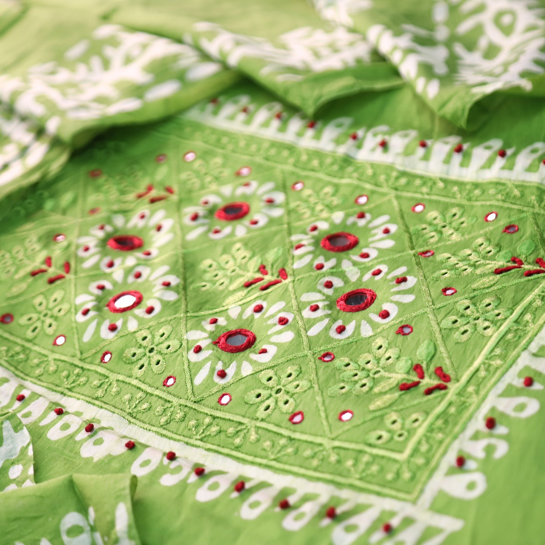 Rupali Parrot Green Schiffli Thread Work with Mirror Neck Batik Print Modal Set