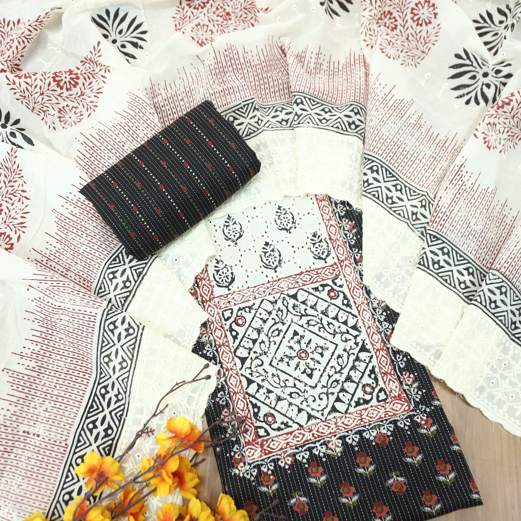 Description- Introducing our floral Work Printed Cotton Top, showcasing intricate block printed Schiffli yoke work along the neckline. Paired flawlessly with a block print work Cotton Dupatta, this ensemble seamlessly blends traditional artistry with modern lace design. The top's vibrant Kutch work and thread embellishments harmonise with the dupatta's prints, creating a captivating look that embodies cultural heritage.