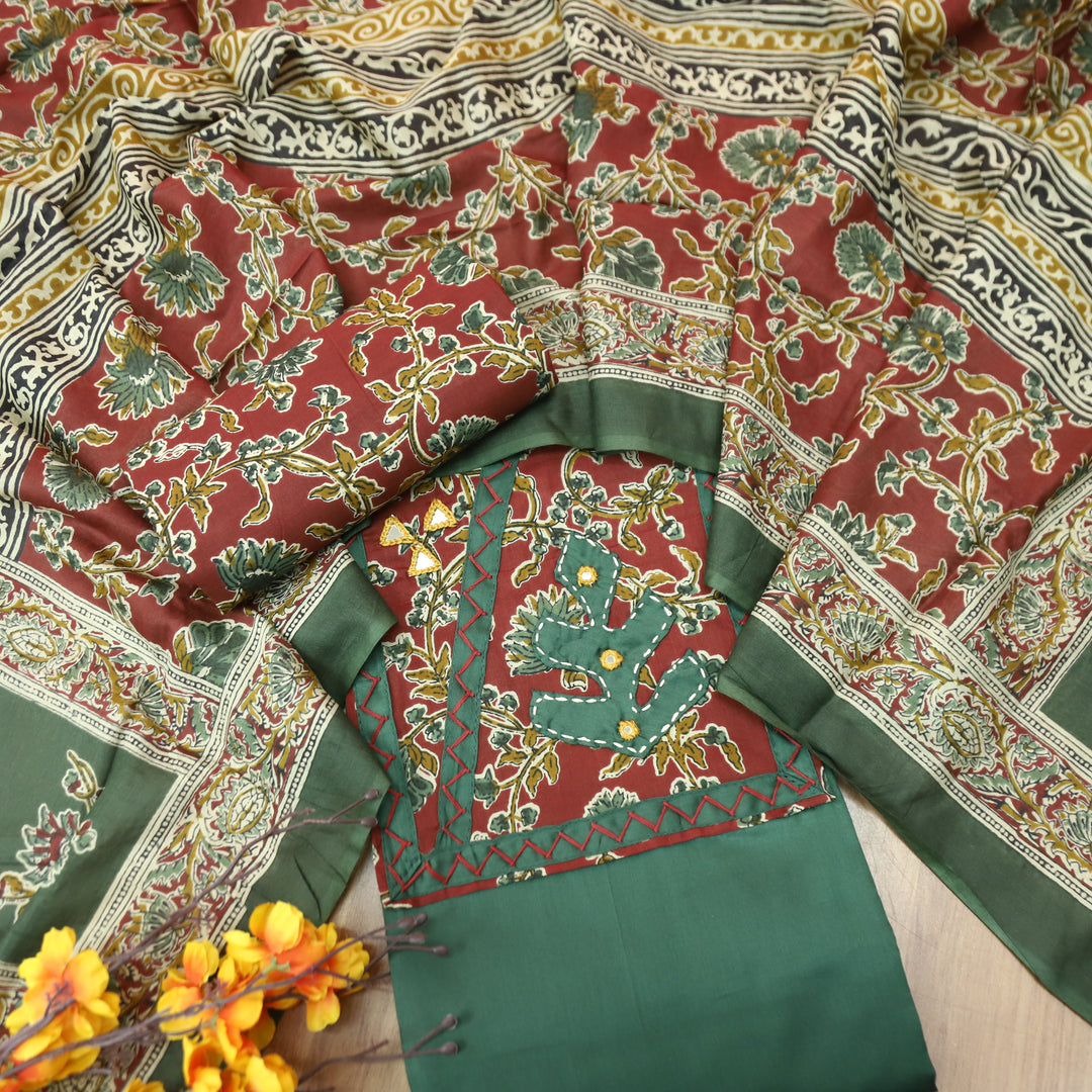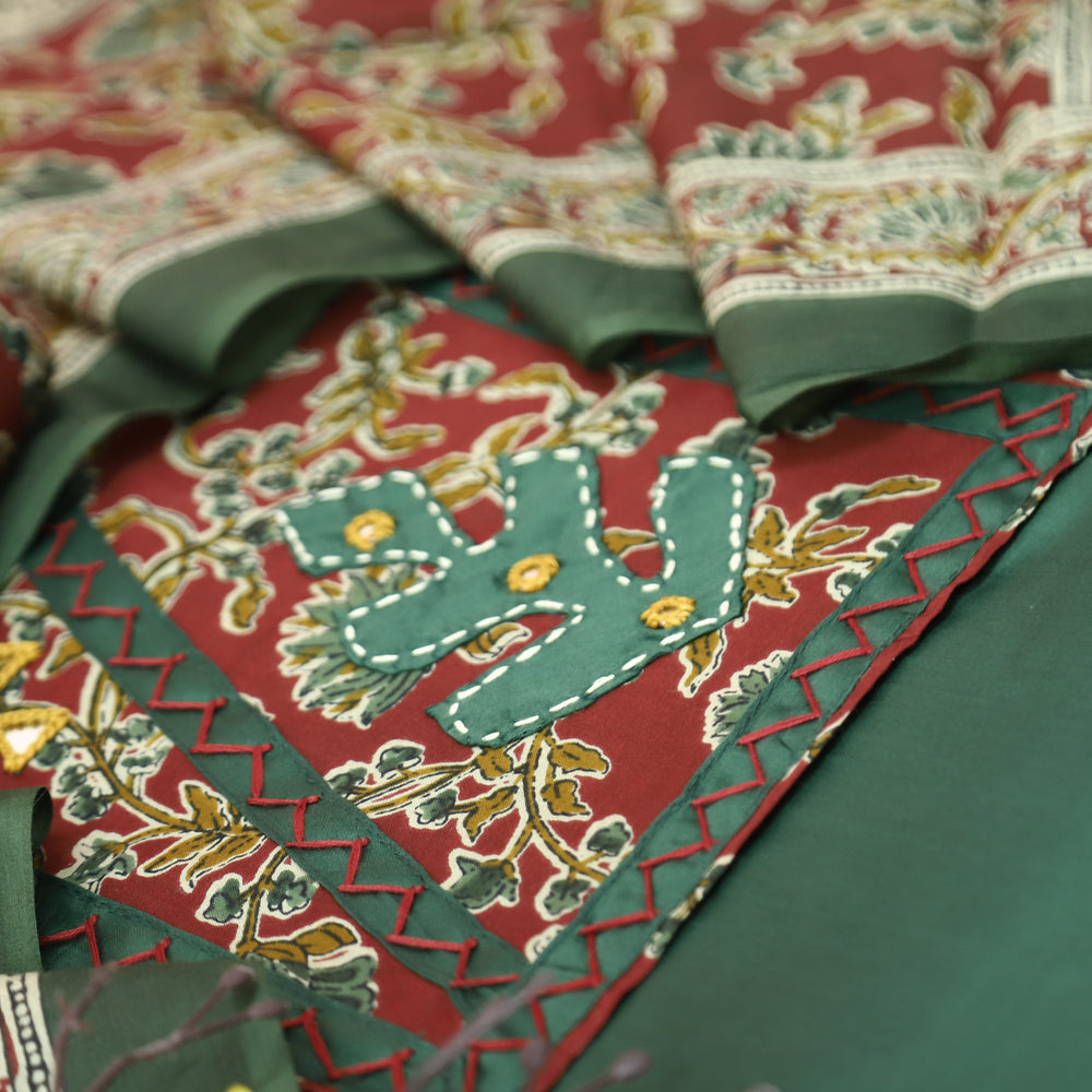 Kriya Sacramento Green Applique Kalamkari Yoke Jam Cotton Set