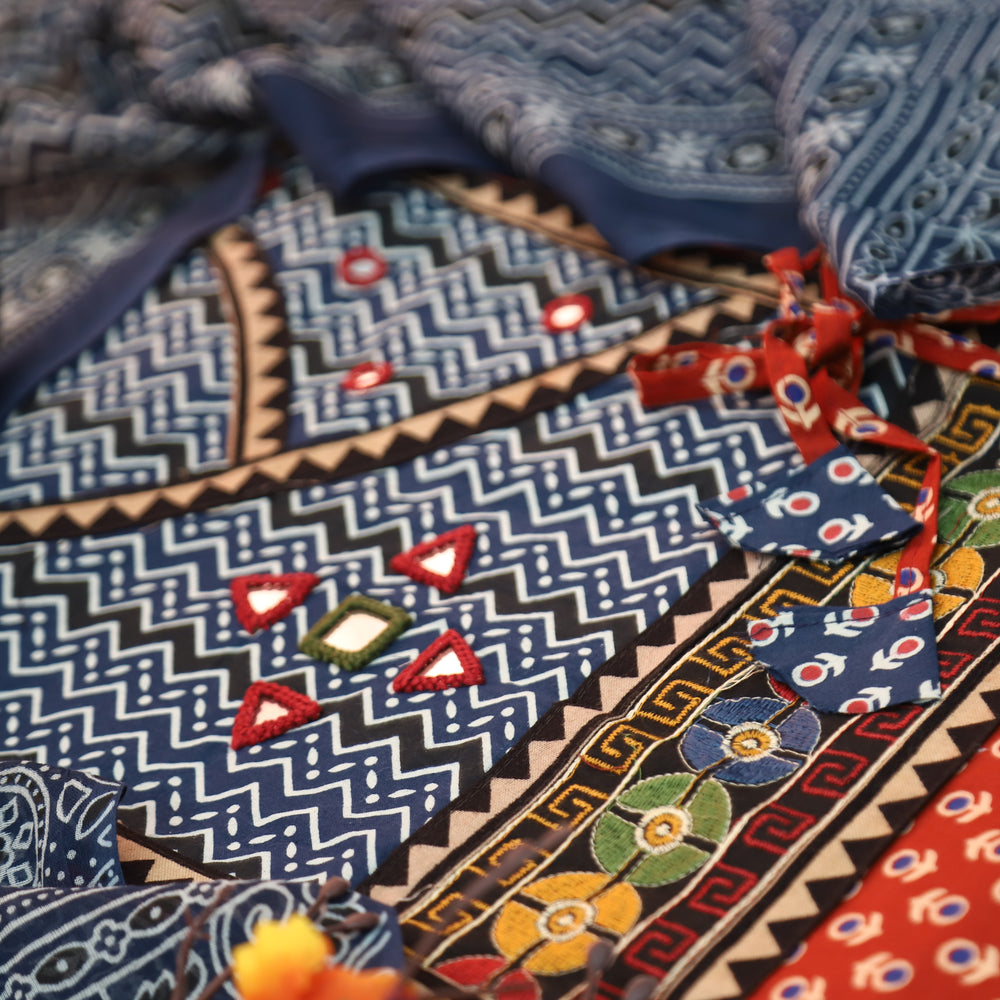 Vaniya Denim Blue Zig-Zag Print Mirror Yoke Ajrakh Print Cotton Set