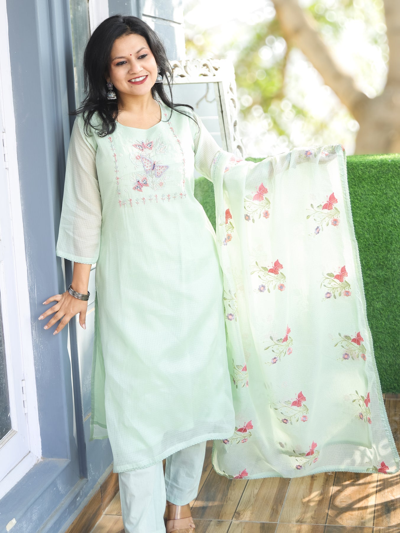 Barista Mint Green Bird Embroidered Neck Work Kota Doriya 3 Piece Set